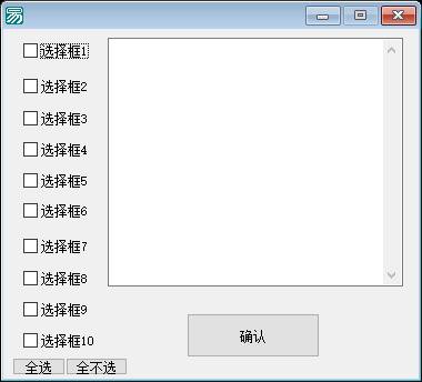 整个程序模拟了一个典型的多项选择交互界面。用户界面上预计存在十个编号连续的复选框控件(命名可能为选择框 1 至选择框 10),以及三个功能按钮和一个用于显示信息的编辑框。程序旨在演示如何通过代码批量控制 UI 组件的状态,以及如何遍历动态获取组件信息以进行数据统计。