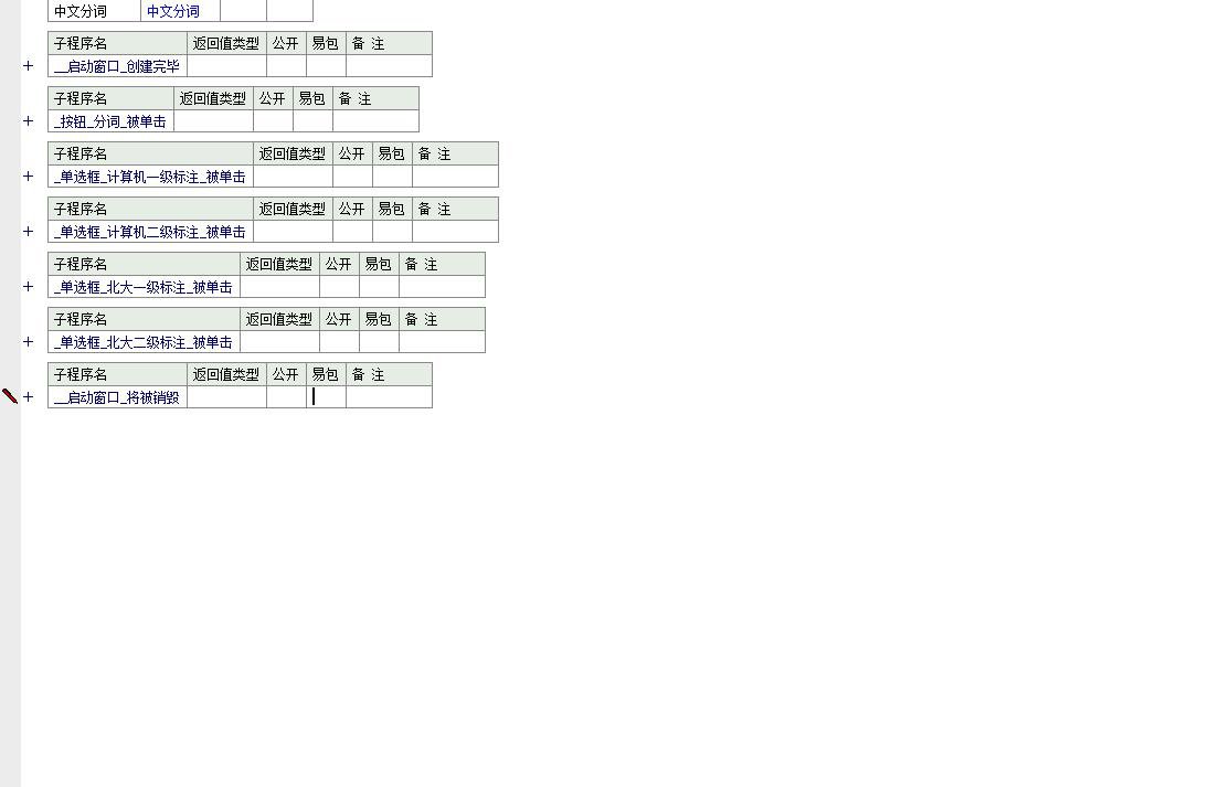 功能说明:该程序是基于易语言开发的一款中文文本处理工具,主要核心功能是实现中文自动分词以及不同标准下的词性标注。程序通过调用一个名为“中文分词”的组件或模块来完成实际的底层算法处理,为用户提供了图形化界面以便进行交互操作。