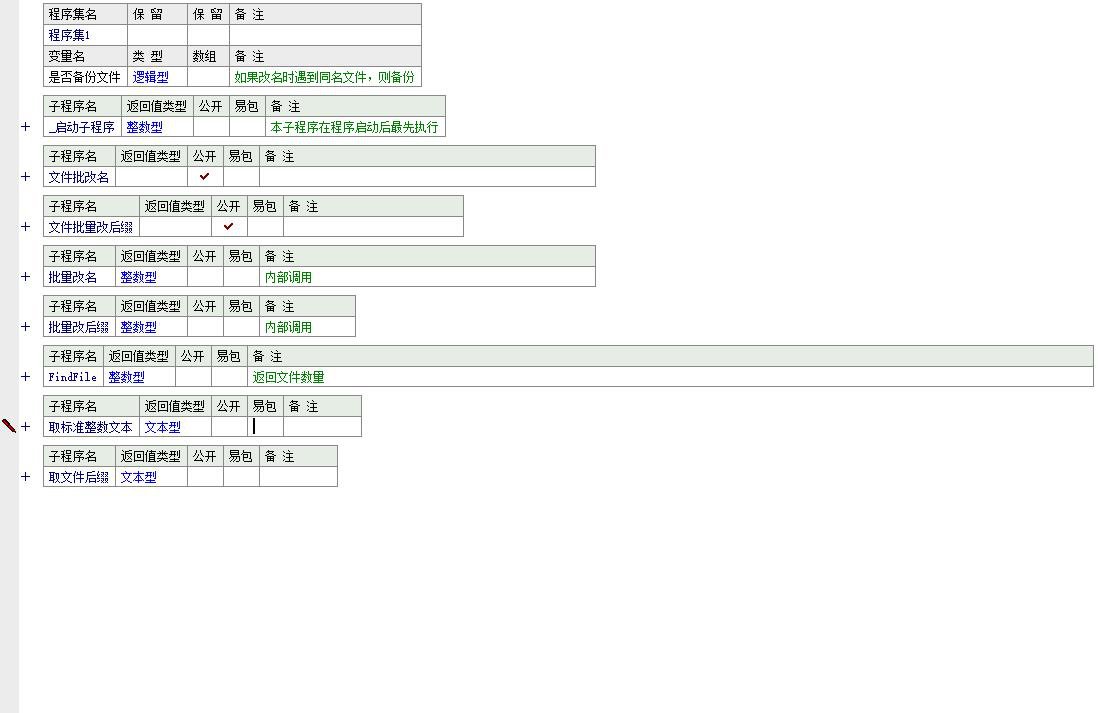 - `.子程序 文件批改名`:用于对文件夹内的文件按照特定规则进行批量重命名。