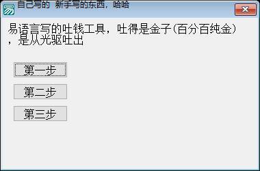 功能说明:这个易语言编写的程序是一个简单的、带有幽默性质的小应用程序。整个程序主要通过三个按钮来模拟一个搞笑的“赚钱”过程。具体功能如下: