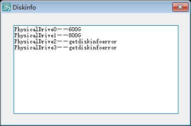 程序启动后会自动扫描前4个物理驱动器(PhysicalDrive0到PhysicalDrive3),调用diskinfo子程序分别获取每个驱动器的信息,并将结果以"驱动器名称——容量G"的格式显示在编辑框中。如果获取信息失败,则返回错误提示"getdiskinfoerror"。