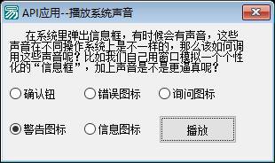 功能说明:这是一个易语言编写的系统声音播放器程序。程序通过调用Windows API中的MessageBeep函数来播放不同的系统声音。界面包含多个单选框选项,用户可以选择不同类型的系统声音进行播放,包括确认音、错误提示音、询问提示音、警告提示音和信息提示音等五种类型。当用户点击按钮并选择了相应的单选框时,程序会根据选择播放对应的系统预设声音。程序主要用于测试或演示系统内置的各种提示音效果,方便用户了解不同类型的系统声音反馈。