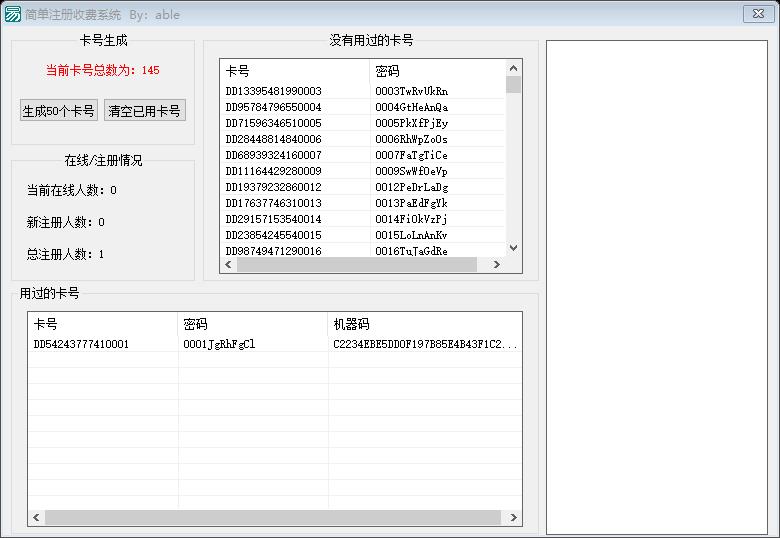 系统结构:子程序_开始验证,子程序_数据到达,子程序_断开连接,子程序_检测是否连接,子程序_是否结束,子程序_账号存取,API_PostMessage,子程序_生成卡号,子程序_生成密码,子程序_读取最后编号,子程序_保存最后编号,子程序_初始化,子程序_添加日志,子程序_修改标签,子程序_没有存在,子程序_搜索,子程序_写卡号,子程序_写用户,子程序_超级列出,子程序_卡号数量,子程序_批量导出卡号,子程序_验证卡号,子程序_总注册人数,子程序_删除卡号,子程序_解密,
